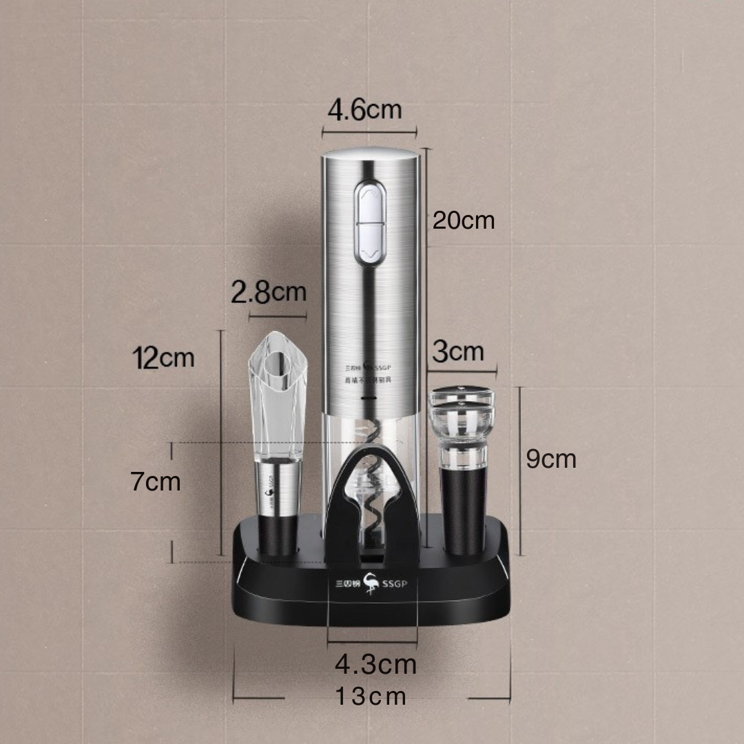 - Itens inclusos: Abridor elétrico, cortador de lacre, bico dosador, rolha a vácuo e base organizadora