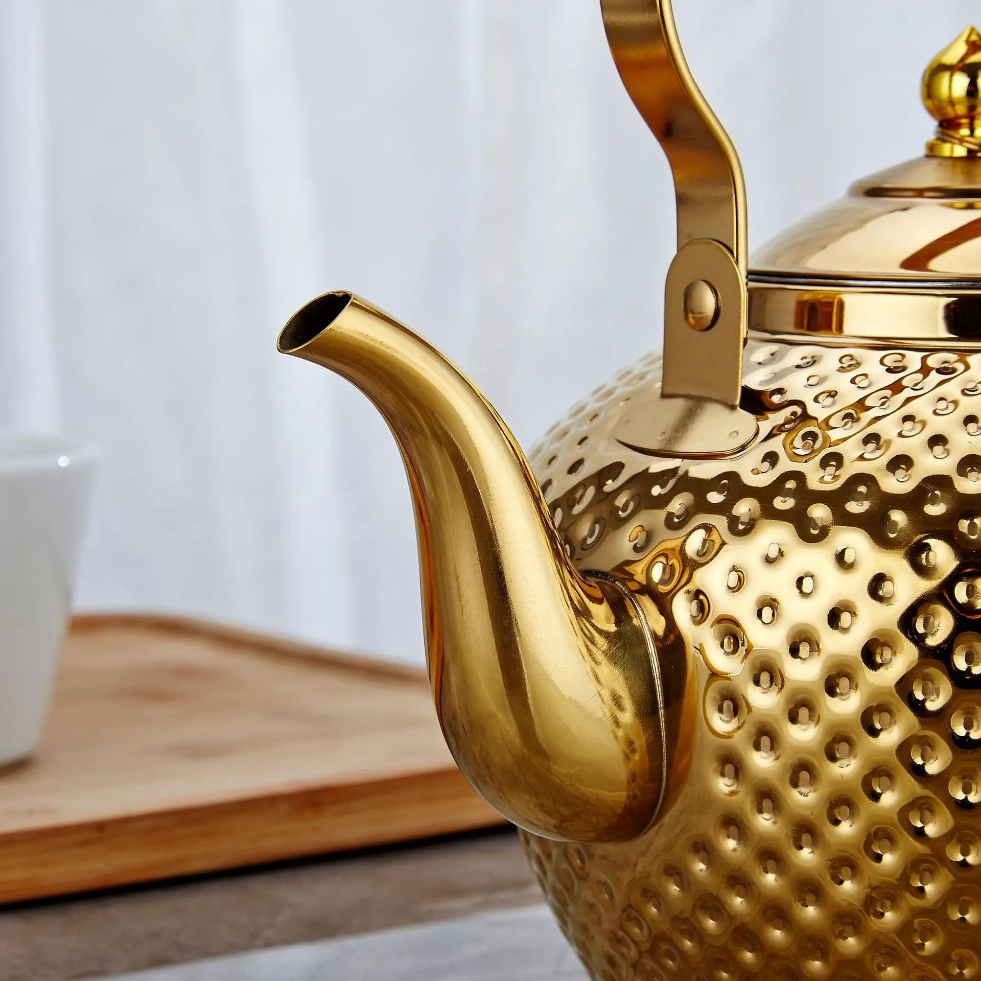 Com acabamento espelhado e textura em relevo martelado, a Chaleira Dourada Casa Splendida transforma o simples ato de ferver água em um ritual de charme e sofisticação. Seu brilho dourado chama a atenção à primeira vista, tornando-se uma peça de destaque na cozinha ou ao servir à mesa.