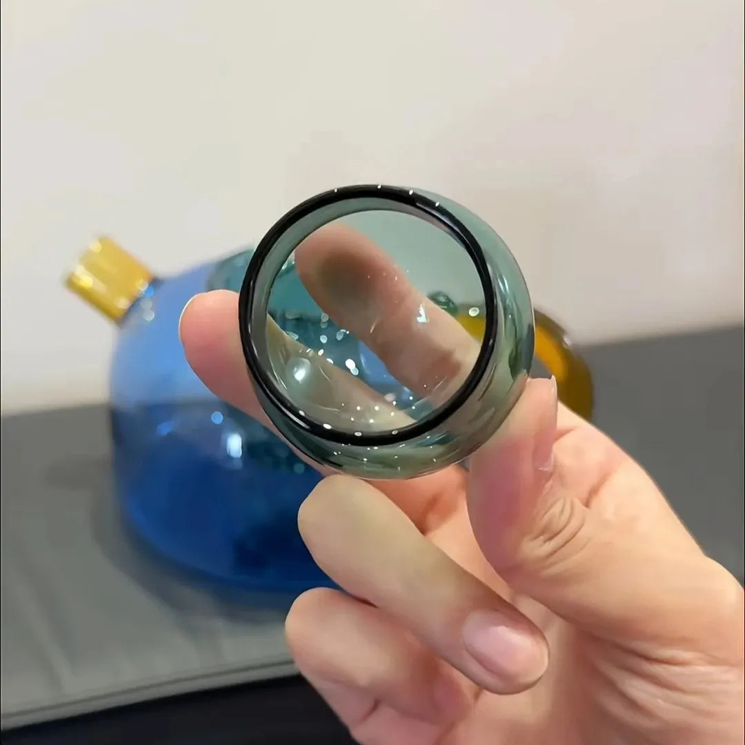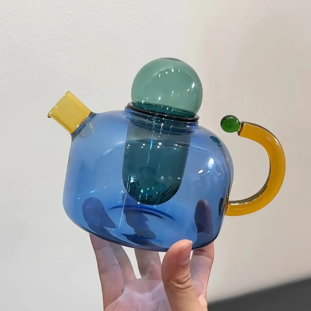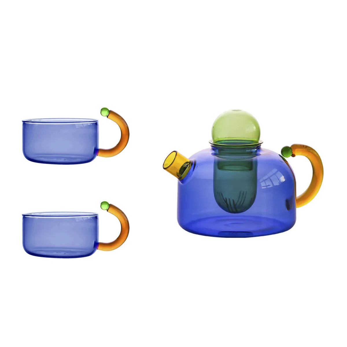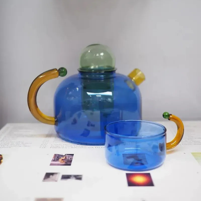 Componha uma mesa única com esta chaleira de vidro azul e seu conjunto elegante de xícaras. A união entre arte, função e beleza se revela em cada curva dessa peça, que transforma o preparo do chá em um momento de contemplação e prazer.