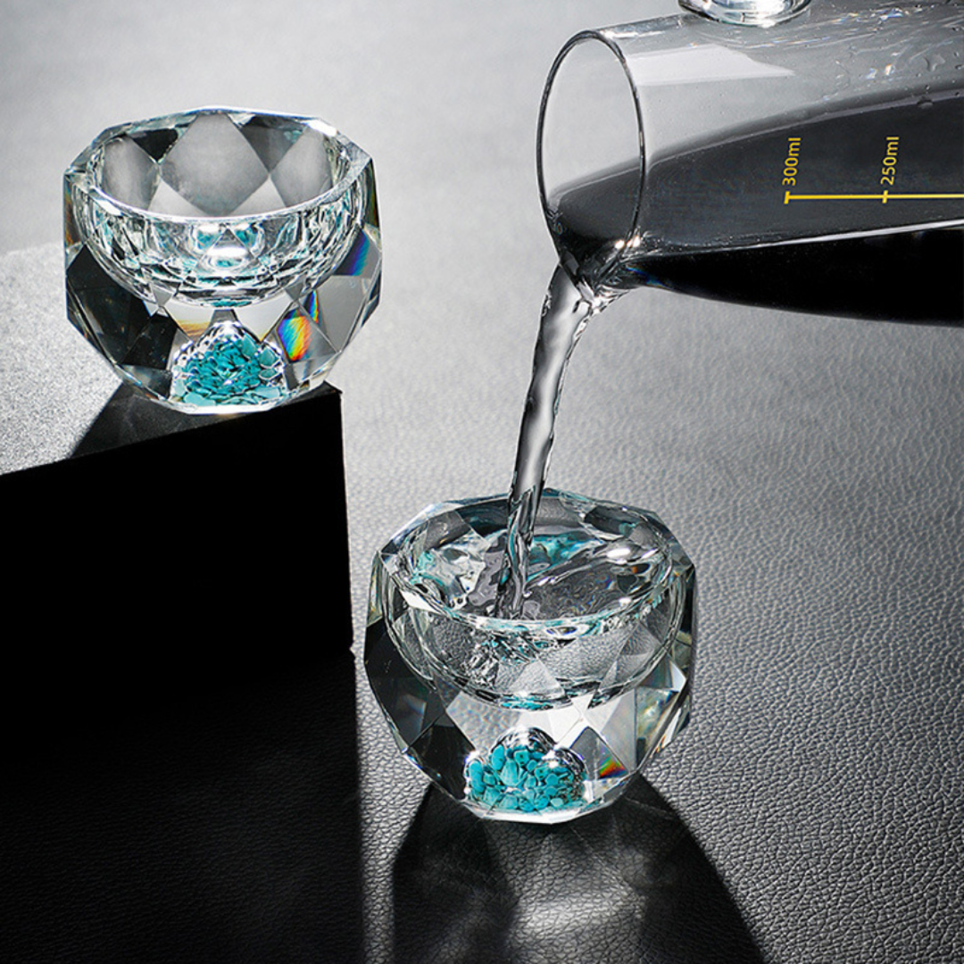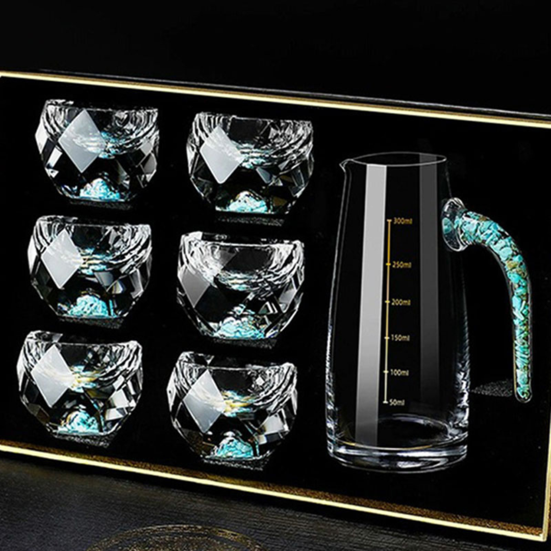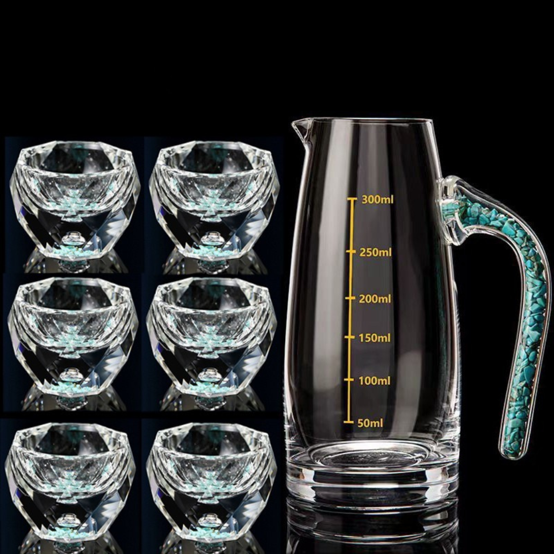 Feito em vidro cristalino sem chumbo, o conjunto impressiona pelo acabamento luxuoso com detalhes em azul  — um convite à apreciação cuidadosa e ao prazer dos sentidos. Ideal para servir licores, saquês, vinhos de sobremesa ou até doses de whisky com requinte.