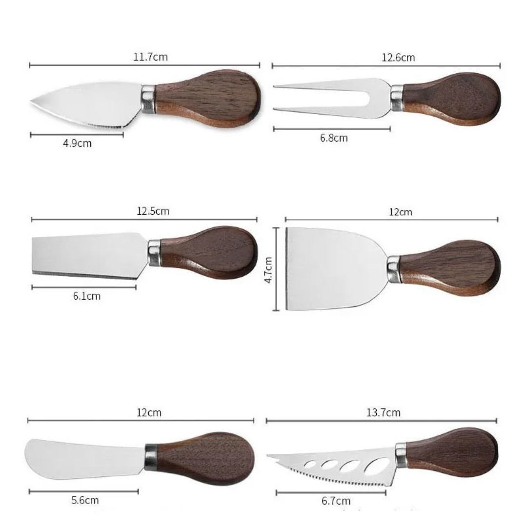 Cada peça conta com cabo ergonômico de madeira de nogueira e lâminas em aço inoxidável 420J2, garantindo resistência ao uso diário e corte eficiente para queijos macios e duros. O acabamento refinado e o equilíbrio entre leveza e firmeza oferecem conforto e precisão ao servir.
