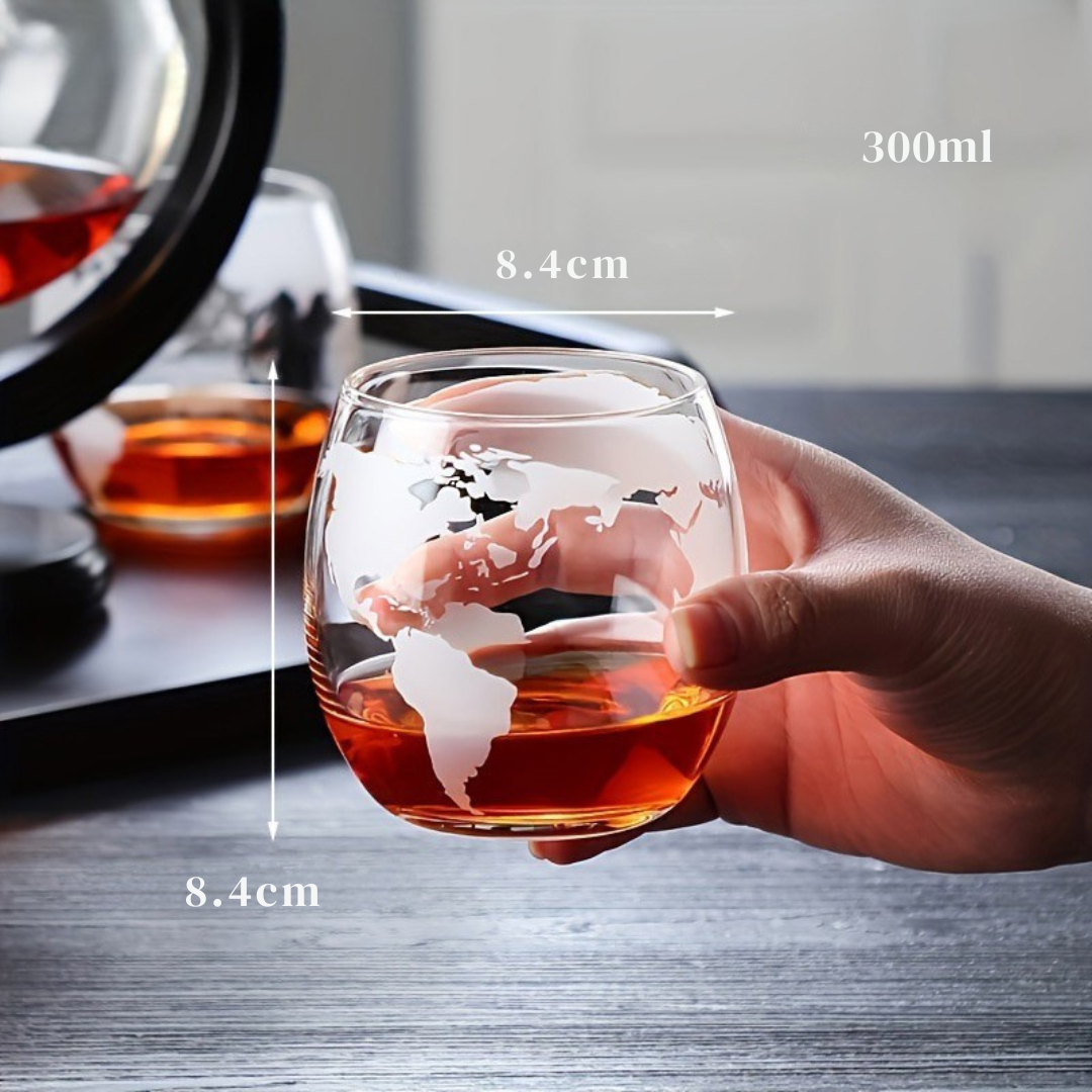 Com 910ml de capacidade, o globo de vidro sem chumbo é sustentado por uma base em madeira maciça e abriga no seu interior um navio soprado à mão, rico em detalhes. Acompanha dois copos de 300ml gravados com o mapa-múndi, além de um funil metálico para facilitar o abastecimento.