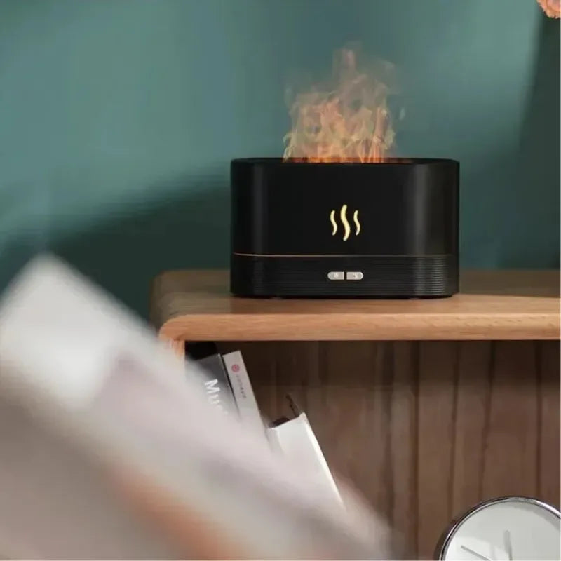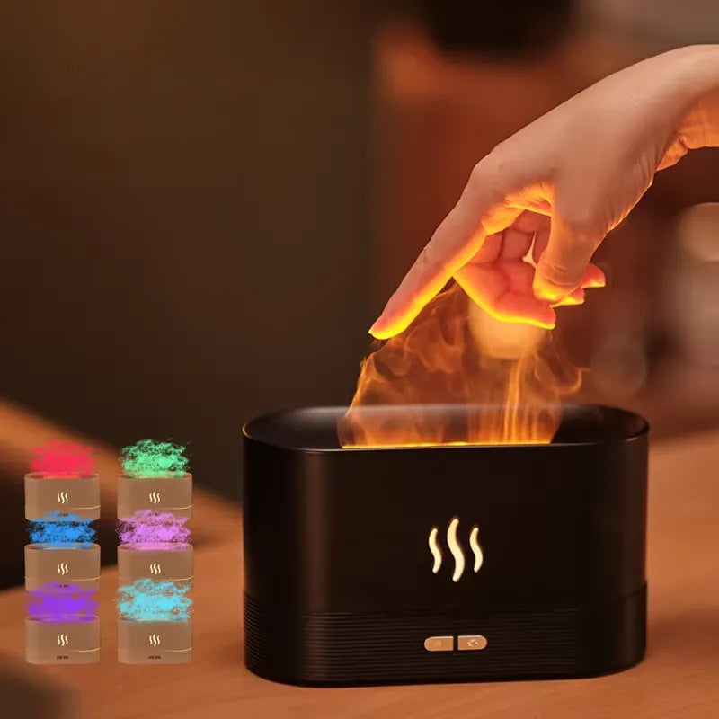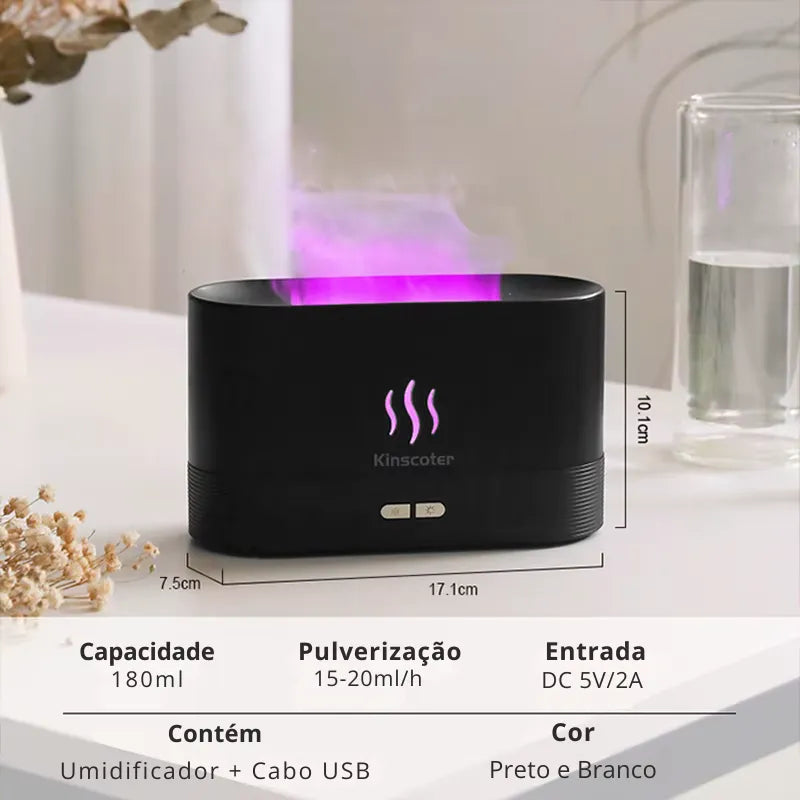 Toque moderno, névoa silenciosa e luzes RGB que simulam chama — perfeito para sala, quarto ou home office.