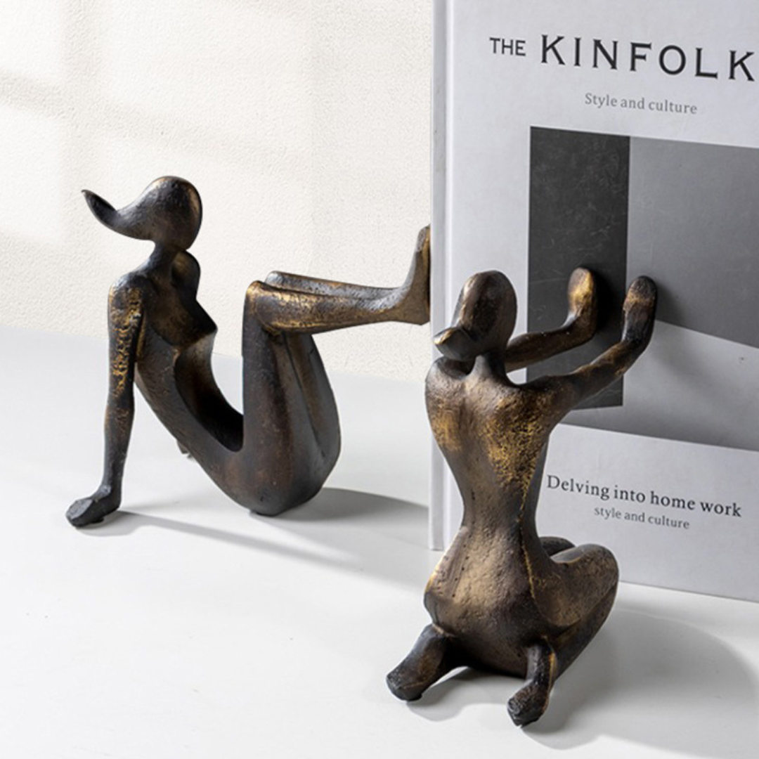 Criada em resina de alta qualidade com acabamento em tom envelhecido, a dupla de esculturas representa duas figuras em equilíbrio — como se sustentassem os livros e, simbolicamente, as ideias contidas neles. É uma peça que desperta contemplação e admiração, perfeita para quem aprecia design, sofisticação e autenticidade no décor.