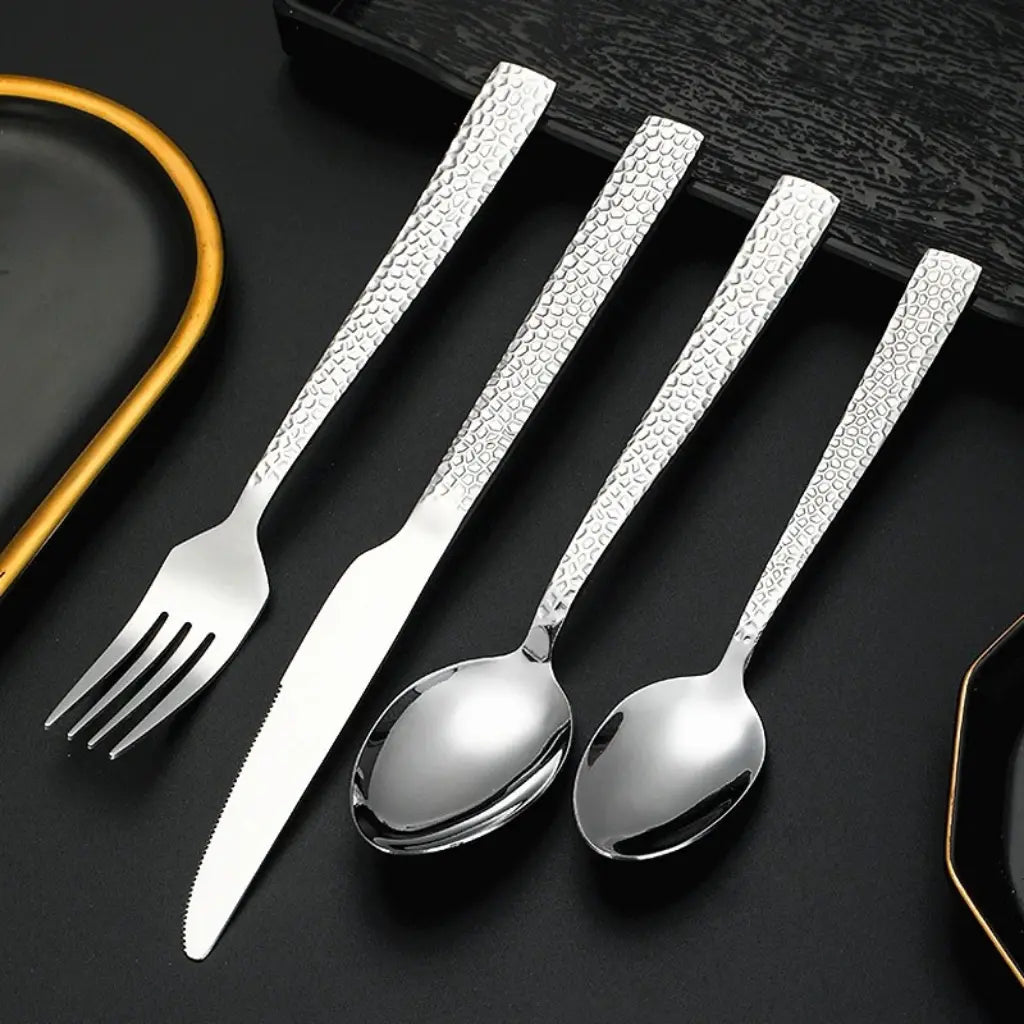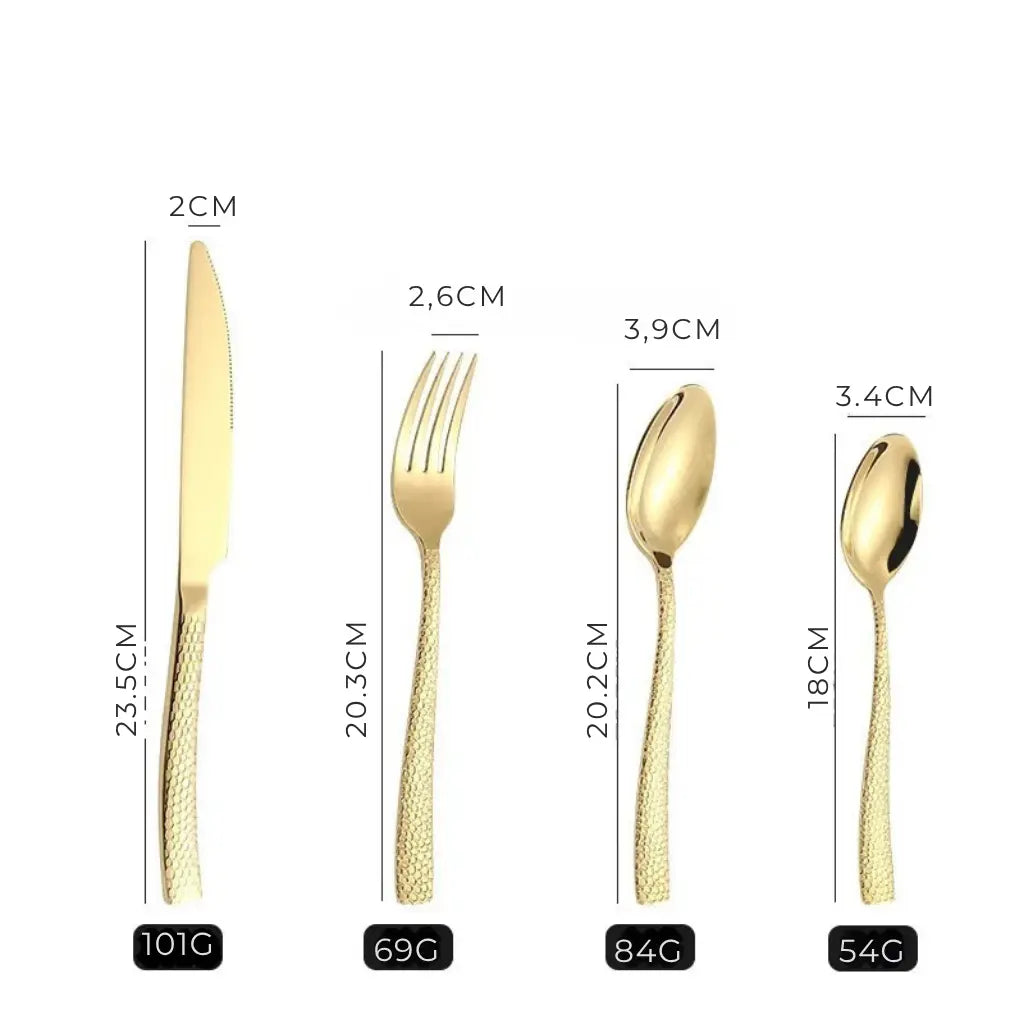 - Composição: 24 peças (6 facas, 6 garfos, 6 colheres de sopa, 6 colheres de sobremesa)