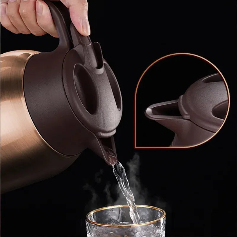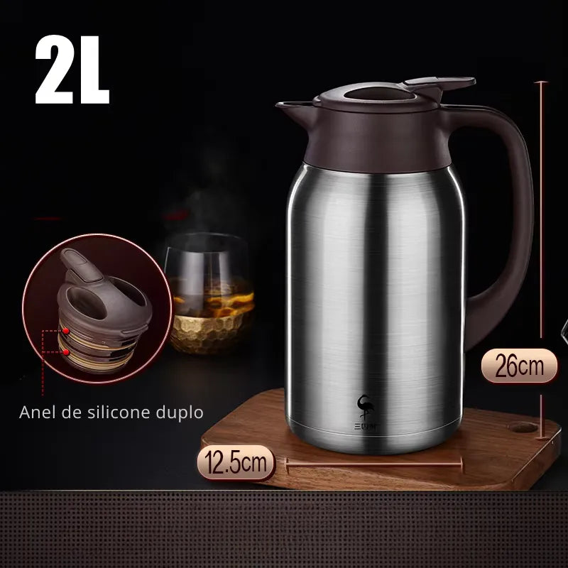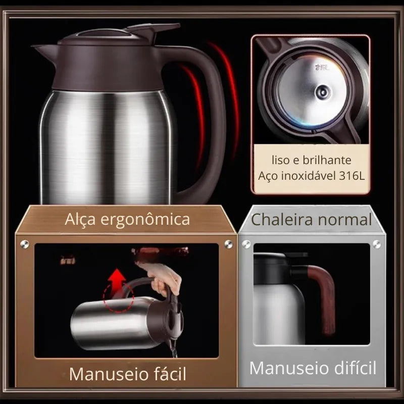 Seu design moderno combina com ambientes residenciais ou corporativos, oferecendo não só beleza como também eficiência. A tampa com vedação inteligente evita vazamentos e permite servir com apenas uma mão. A alça ergonômica em polipropileno escuro garante conforto e segurança ao manusear, mesmo com líquidos quentes.