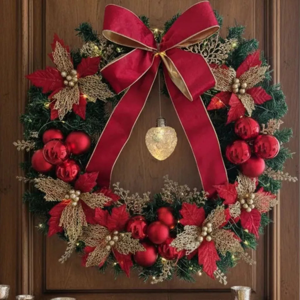 Imagine chegar em casa e ser recebido por uma guirlanda que realmente faz o Natal acontecer. Imagine a porta iluminada, o laço vermelho impecável, as flores, as bolas brilhando… e aquele coração aceso no centro, como se abraçasse quem entra.
