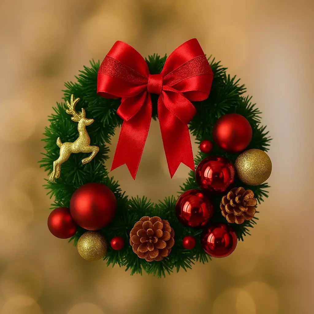 - Elementos decorativos: laço de tecido, bolas natalinas, pinhas e folhagens artificiais