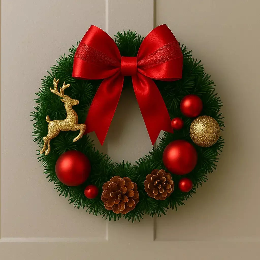A Guirlanda de Natal para Porta Casa Splendida é aquele detalhe que transforma a chegada em casa. O laço vermelho em destaque, as bolas douradas e as folhagens verdes criam uma moldura natalina clássica e elegante, perfeita para receber a família e os amigos com clima de celebração.