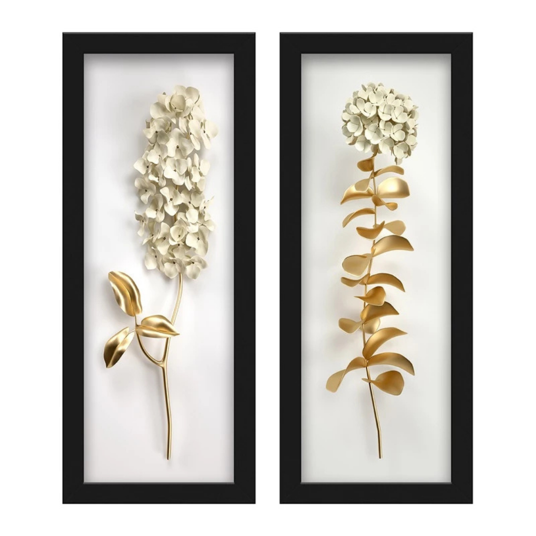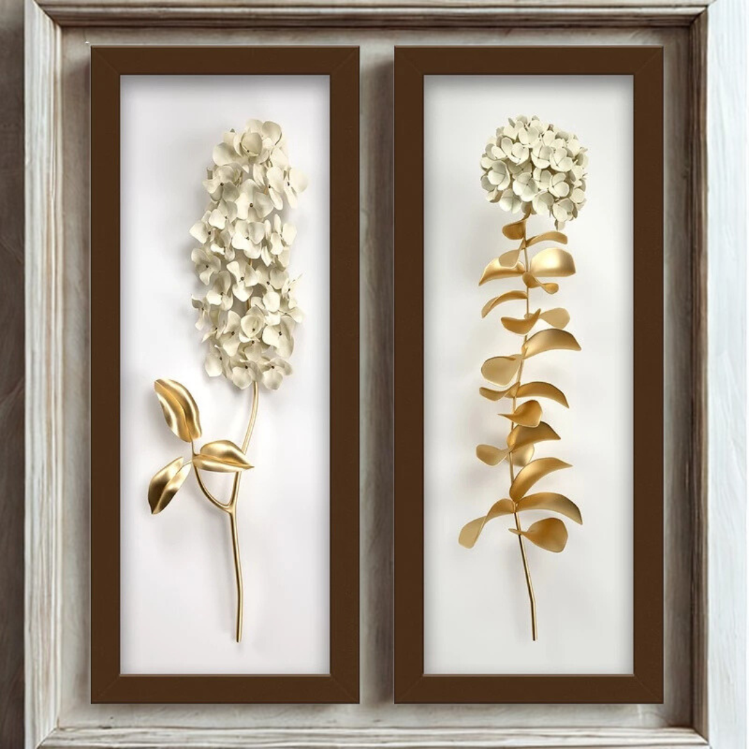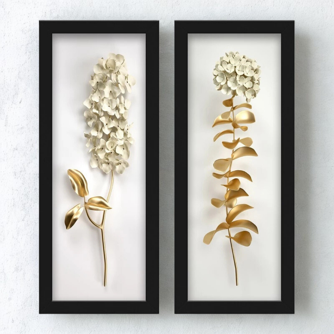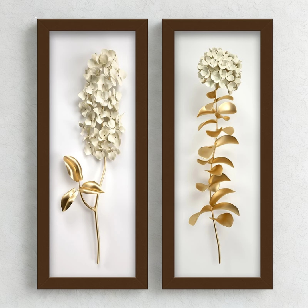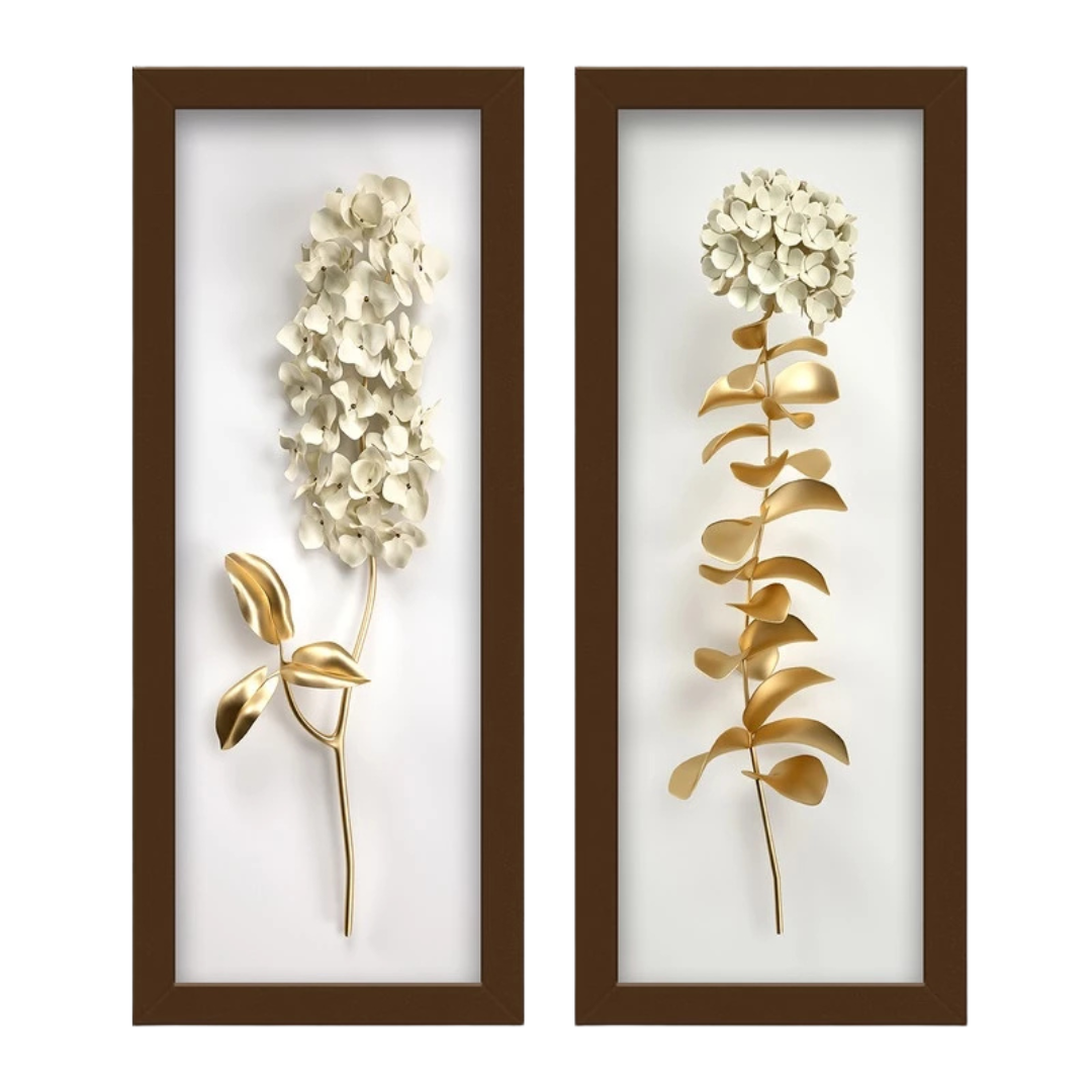 Kit 2 Quadros Flor Dourada Branco Moldura Madeira Casa Splendida