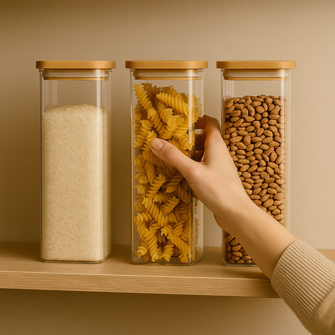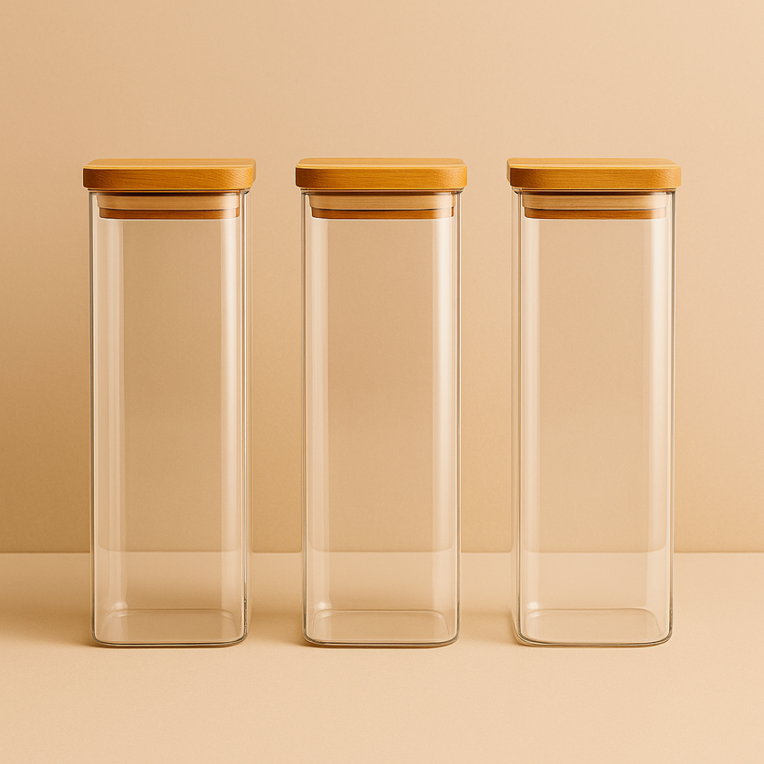 Com formato vertical e 1L de capacidade, esses potes são ideais para armazenar mantimentos como arroz, feijão, macarrão, cereais ou castanhas com eficiência e charme. A tampa de bambu com vedação em silicone preserva os alimentos por mais tempo e ainda garante um toque natural à decoração.