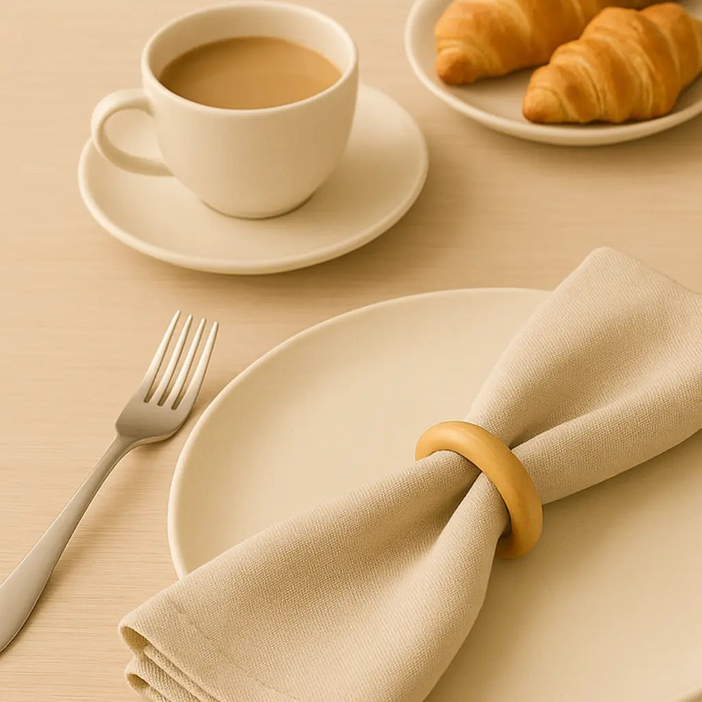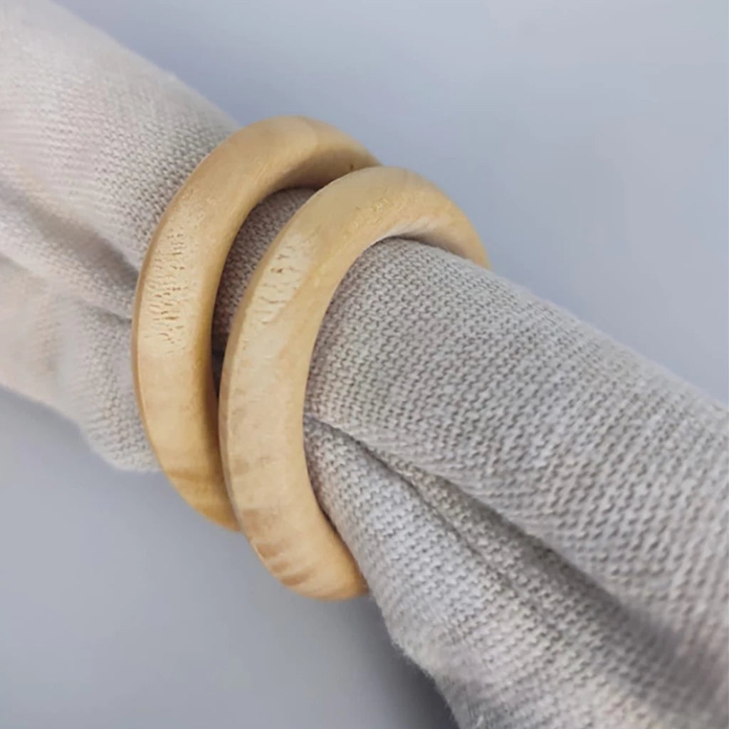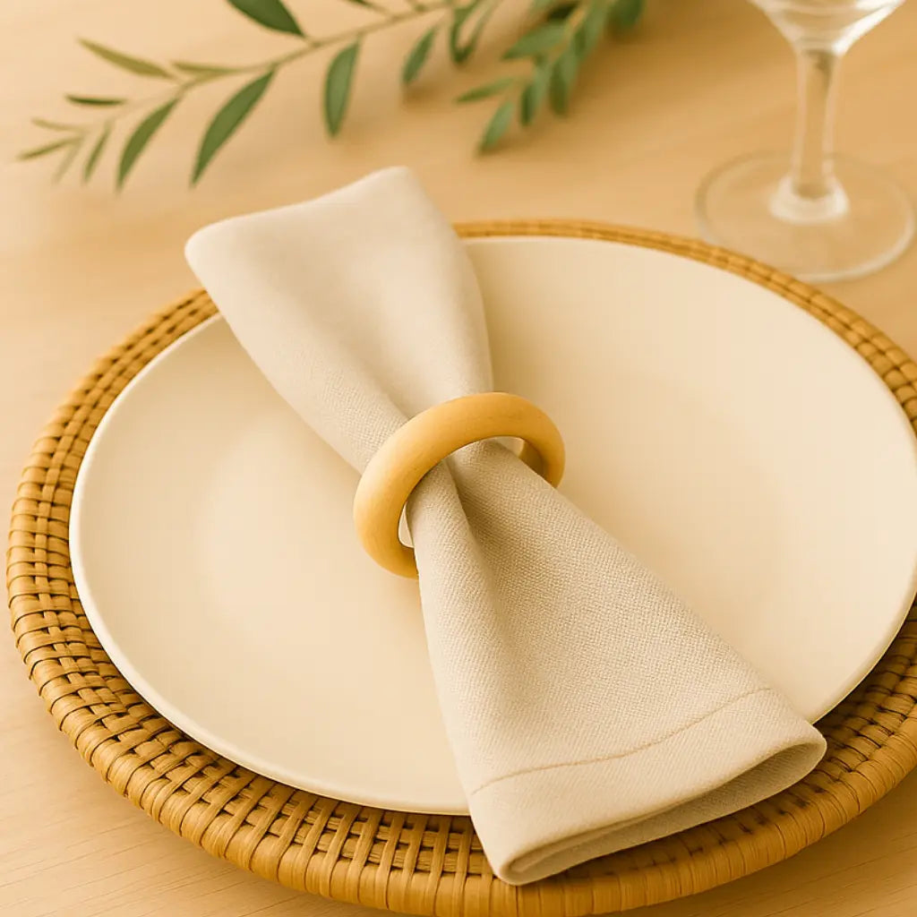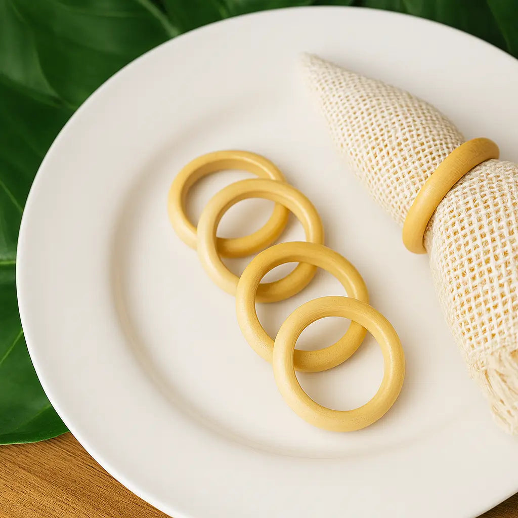 Anéis de guardanapo em madeira natural com visual minimalista e atemporal, perfeitos para composições acolhedoras no dia a dia ou em ocasiões especiais.