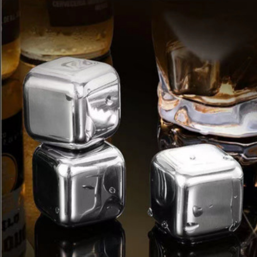 Feitos em aço inoxidável 304 de grau alimentício, cada cubo possui interior selado com glicerina e água purificada, garantindo resfriamento eficiente e prolongado, sem diluir ou alterar o sabor da bebida.