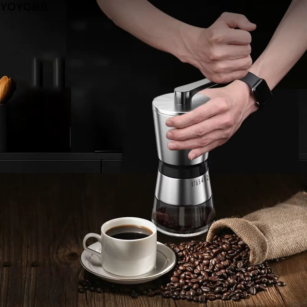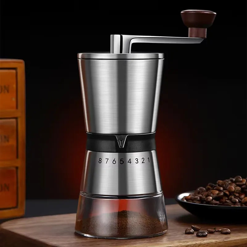 Com 8 níveis de espessura ajustáveis, é possível adaptar a moagem ao seu método preferido — do espresso à prensa francesa. Seu núcleo cerâmico garante menor atrito e temperatura estável, preservando o sabor original. A alça de madeira, o corpo em aço inox 304 e a base de vidro transparente tornam o processo mais confortável, bonito e funcional.