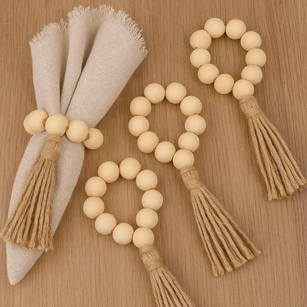 Transforme sua mesa posta com o charme rústico e elegante do Porta-Guardanapo de Contas de Madeira com Tassel da Casa Splendida.