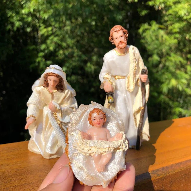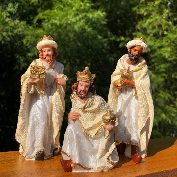 As peças possuem entre 4 e 15cm, formando um presépio de tamanho médio, versátil e perfeito para salas, mesas decoradas, aparadores e cantinhos de oração. A resina garante um toque especial, mantendo detalhes refinados, expressões suaves e cores harmoniosas, que elevam a decoração natalina sem perder a essência sagrada.