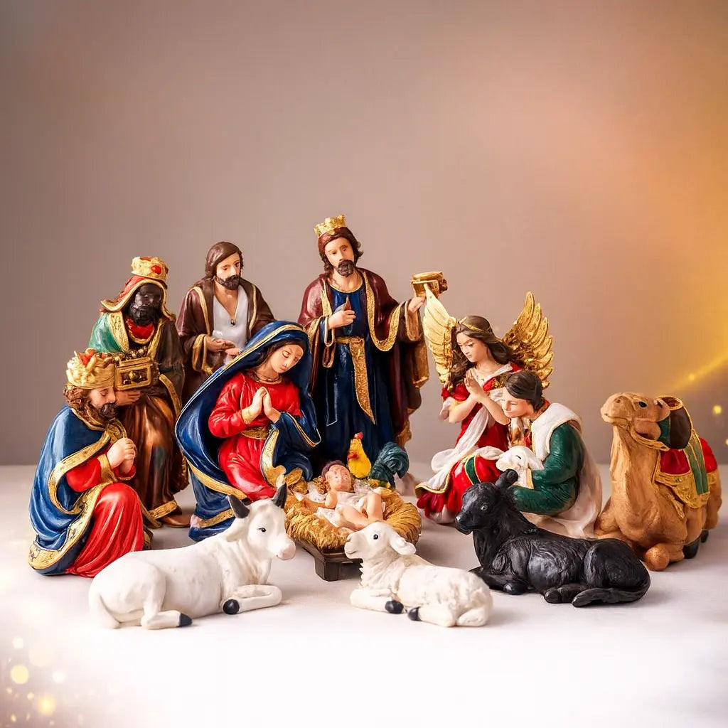 As peças grandes e detalhadas trazem um acabamento elegante e expressivo, com cores vibrantes e pintura artesanal. Por ser inquebrável, feito em borracha reciclada resistente, você pode montar, guardar e transportar sem medo de acidentes — ideal para novenas, encontros religiosos, retiros e eventos. O conjunto inclui 14 personagens essenciais, todos proporcionais e cuidadosamente produzidos para retratar cada elemento da cena do nascimento de Jesus. O Menino Jesus é solto, podendo ser retirado da manjedoura — um detalhe que muitas famílias amam pela simbologia. É perfeito para salas amplas, halls, mesas decoradas, cantinhos de oração, capelinhas domésticas e ambientes que merecem uma peça imponente.
