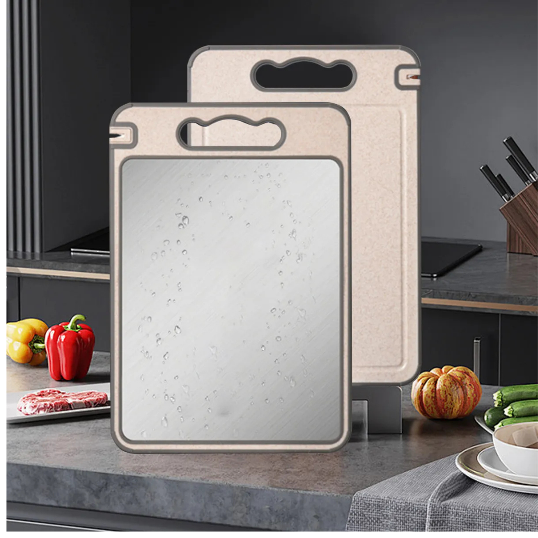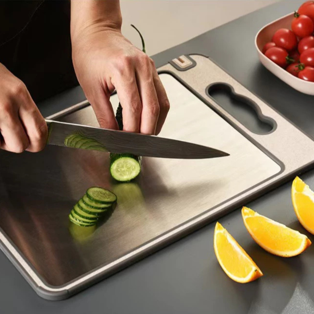 Ao contrário das tábuas convencionais que acumulam germes em rachaduras, a superfície em inox desta tábua permanece inerte, lisa e segura, mesmo após usos repetidos. Uma solução prática e duradoura que combina bem com qualquer estilo de cozinha.