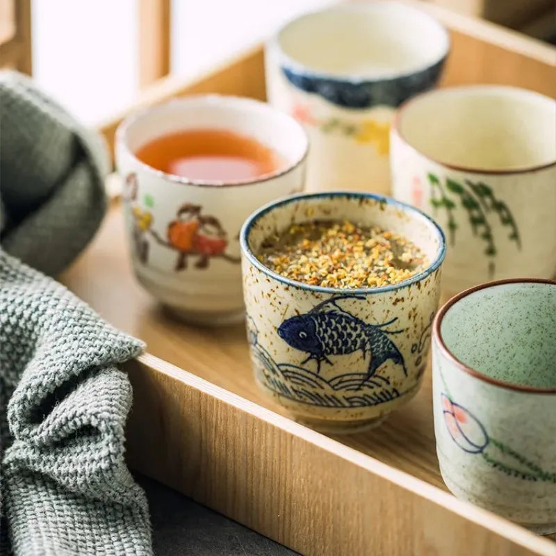 Saboreie café ou chá em xícaras japonesas de cerâmica, com estampas exclusivas Peixe Azul e Pássaros, trazendo tradição e elegância à sua mesa.